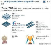 泡泡网主板频道8月11日 来自匈牙利的玩家over@locker886近日又有纪录打破——他使用技嘉P55A-UD7打破了之前一直保持在5.53GHz的Pentium G6950世界纪录,将这项成绩一举推向了5.85GHz! 他使用的配件包括了技嘉P55A-UD7、Intel Pentium G6950、Kingston HyperX DDR3-2130@8-9-8-24。