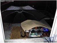 泡泡网主板频道12月26日 对于超频,我们曾经做过很多疯狂的举动,比如将空调的冷空气导流朝向平台,或者在北方大冬天开着窗户超频……这次国外又出现了一位在雨中超频的玩家——他将平台搭载室外,靠下雨后室外温度低的特点来进行超频。 窗外一片草席,草席上一堆零件,零件上一张纸板,纸板上一把伞……Listen to the rhythm of the falling rain…… 从这张