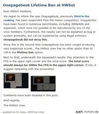 [泡泡网主板频道6月17日]北京时间2009年6月16日,HWbot(HWbot.org)在世界范围内发表公告,称之前在其综合超频排行榜总成绩排名第三的台湾玩家“狂少”(ID:Onepagebook,以下简称OPB),由于无法解释其3DMark06以及Aquamark超频数据中所出现的不正常得分情况,已被HWbot禁止参加该网站举办的一切超频排行及竞赛活动。此事已成为本年度继“LT”战