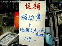 [MOUSE.PCPOP.COM 9月21日讯]:从今年五一劳动节的七天长假回来,小编和几个同僚又在盘算着如何过国庆节?外出游玩人太多,费用太高;公司上班聊QQ,没加班费。思来想去,还是别太折腾了,志同道合的悍匪、民警通宵达旦岂不快哉!技术可以在长时间的实践中得以提升,硬件环境也是制胜法宝。血汗钱要用在最需要的地方——鼠标、鼠标垫。 促销海报 怎么样?商家摆在一个很不起眼角落里的广