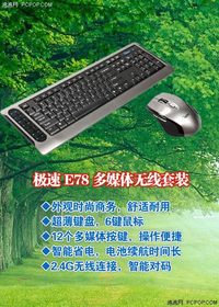 泡泡网鼠标键盘频道10月30日 随着人们生活节奏的加快,使用自如、操作简便的多媒体无线套装越来越受到消费者的青睐,它不但使用起来没有连线的束缚,还能让用户一键完成多种操作,轻松的享受娱乐、办公生活。厂商方面对此自然是非常重视,时常推出相应的新品。极速的E78就是近期上市的新品之一。 极速E78多媒体无线套装定位于一般大众用户,不单具有丰富的多媒体功能,还有着防水能力强、节