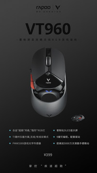 老牌实力大厂,国产外设领军品牌雷柏(RAPOO)发布的VT960屏显双模无线RGB游戏鼠标,使用未来科技范的创意镂空超跑造型,拥有1680万色RGB灯光系统,客制化的OLED显示屏,随时知悉战鼠的一举一动。搭载原相3389的专业传感器,可在50-16000DPI中以50DPI为单位逐级微调,5000万次的欧姆龙清脆手感微动开关,性能和手感得到极大提升;Ti德州仪器的无线方案,能在无线模式下亦能获得媲美专线般的传输效能和稳定性。板载内存、编织线材、镀金USB接口、特氟龙材质脚垫,优秀的工业设计与表面材质保证了长时间游戏的舒适度。仅售399元,相信它一定会成为你首选的游戏利器,给你畅快的游戏操作体验。