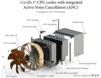 泡泡网散热器频道6月15日 猫头鹰在 Computex 上发布了该公司的首款主动抑噪(ANC)散热器。猫头鹰展示的其实只是一个原型,它是在 NH-D14 基础上增加了 ANC 控制器、ANC 平衡圈、ANC 麦克风、ANC 磁铁等东东摇身一变而成。 实现主动抑噪的目的自然是让风扇跑得更快而噪音保持在未用该技术时较低转速的水平,如此一来散热器的散热效能/噪音比就得以提升。■
