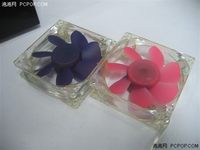 【泡泡网散热器频道】爱酷炫的朋友,在选择机箱风扇时都会选择UV风扇或是能显示温度的风扇,目的就是为了让机箱看上去更酷。现在你除了UV风扇以外又有了新的选择,能根据机箱温度而改变颜色的风扇,笔者记得几年前还有类似的设计在衣服上,没有想到此类设计竟会用到风扇上。你觉得扇叶哪种颜色是常温时的风扇未加热时的颜色 风扇在常温下的颜色是紫色,除了扇叶的颜色外其它地方跟普通风扇一样,然后我们用电吹