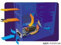 ■显卡全新散热理念引发的思索 2005年10月,技嘉发布了其第二代Silent-Pipe技术——Silent-Pipe II。Silent-Pipe II采用了全新的前导式散热模块,能够在无需风扇的情况下,利用机箱内外压力差,配合CPU和系统风扇将热量排出。 Silent-Pipe II打破了传统的设计思路,在显卡I/O挡板的下部并排放置了一个舱状散热模块,显示核心的热量可以通过热管迅