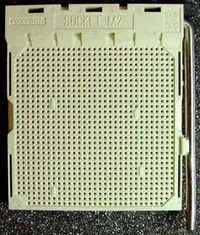 首先让笔者为大家解释一下,什么叫“M2”。这里所说的“M2”,其实是指AMD将要在2006年第二季度推出,用以取代目前的Socket939/754接口的新一代CPU插槽接口,届时它的针脚数目将会为940。 AMD M2插槽实物图 而一提到“M2”,就不得不提最近在CPU市场里吵得沸沸扬扬的“双核CPU”一词。所谓双核CPU是指在一个处理器上集成两个运算核心,从而提高计算能力。“双核