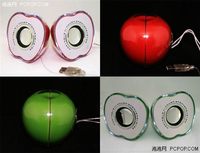 泡泡网音频频道9月20日 这是在沿海一带非常受欢迎的苹果音箱中的一款AU-2093A/B,有红色和绿色两种颜色,也是最像苹果的一款了。 这款音箱的设计非常有特点,苹果皮是厚度为2-3cm的高光ABS塑料,白色的苹果瓤,而苹果核是银色的喇叭铝膜。两半苹果拼在一起就成了一个完整的苹果,造型圆滑美观,携带方便。 当然“山寨”的强大之处肯定不在于这些外在的东西,最让人眼前一