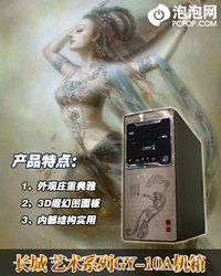 泡泡网机箱电源频道2010年4月1日 从去年开始,市场上悄然流行起一股炫板风潮。所谓炫板就是简化面板上的功能设计并将布局集中化,前置功能接口和设备面板都集中在一个相对较小的区域里,这样面板上就能留下大面积区域用来展示靓丽图案,而且亚克力材料的运用配合上3D视觉设计,更给人的视觉感官以强烈冲击,让机箱面板色彩和图案的装饰更上一层楼。 长城艺术系列机箱GY-10 长城推出的
