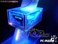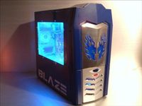 这是Razotech公司带来的一款叫做“Blaze”(火焰)的机箱。Blaze机箱的外形尺寸为450 x 220 x 430mm,出于成本的考虑仅仅使用了0.5mm的SECC钢板让人觉得有些不尽人意。机身整体色调为蓝色,银色面板处的蓝色花纹便象征熊熊燃烧的火焰。 Blaze机箱整体视觉效果 机箱一侧采用目前流行的透明侧板设计 机箱顶部预留扩展USB、1394和音频接口