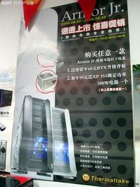 著名机箱电源厂商Tt,在购买迷你小盔甲、海啸、Matrix(矩阵)机箱加99元送Tt XP350电源活动即将结束之时,在原活动的基础上缩小范围加强力度,即将展开新一轮的暑促活动,既凡在8月10日到9月10日期间,在Tt形象店购买任意一款ArmorJr.机箱,即赠送价值68元BTX升级背板或加99元送XP355额定功率300W电源一个,以上优惠任选其一。 店内海报 Tt Armor Jr.(
