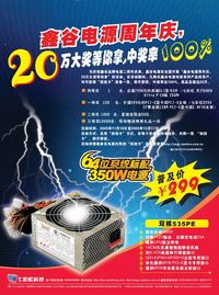 截止到今年11月18日,鑫谷电源成立已经整整两周年了。如今,为了答谢广大用户对于鑫谷电源的支持,以及满足更多玩家对于高品质电源的追求,鑫谷电源将于2005年11月18日至12月17日,在全国展开“鑫谷电源周年庆,20万大奖等你拿”活动。 在活动期间,凡购买鑫谷电源双核系产品的用户,均可获得刮刮卡奖卷一张。即开即奖,中奖率高达100%%。 丰富的产品线 本次大奖设立