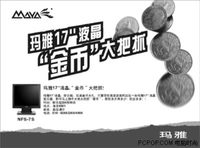 [LCD.PCPOP.COM 5月3日讯]:在五一黄金周期间,液晶显示器市场中的各种促销活动比比皆是,打折优惠大促销什么的活动,已经成为节日消费的主题。玛雅液晶显示器在市场中的知名度,已经给众多消费者心中留下深刻印象。 在五一期间,玛雅不仅将旗下最出名的“极速王”NFS-7S液晶显示器售价一举降至2099元的5·1劳动价,同时正在举办非常独特的“金币”大把抓促销活动活动,抓多少送多少