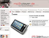 今年在德国举行的IFA展会上,COWON即向外界面正式宣布A3将于9月份正式上市,这一消息已经近日得到得到证实——A3已经在欧洲开卖啦!COWON A3正式亮相价格曝光 在这个欧洲网站上,可以看到A3的上市价正如此前网络媒体透露的一样,60GB的售价为499欧元(684美元,约合RMB5180元),A3的另一个版本30GB的售价为449欧元(615美元,约合RMB4660元),A3的另一可选