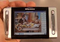 BenQ-Siemens最近风头正盛,在本次CeBIT盛会上展出7款新机,甚至还推出了DVB-H设备,一起来看看由西门子“玩”出来的这款东西。 这款产品采用3.6寸分辨率为640×480的26万色TFT屏幕,主要依靠触控笔来操控,根据现场演示的画面,可以看到BBC以及 CNN新闻。机身两侧各有一个扬声器,如果不注意,还真会把它当成一款PMP产品。 现场演示 机身厚度还是比较可观的