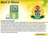iPod带给创新的压力实在是太大了,作为国际品牌的创新是绝不会服输的,去年年底推出的Zen Vision:M一面世就被大家看好,被很多媒体称为可以与视频ipod抗衡的产品,而在许多业内人士眼中,不管是性能还是外观,这款新品也确实够实力与iPod分庭抗礼。最近的CES展会上,创新带着这款产品参加展出,CNET对参加本次展会的消费电子产品进行了评选,Zen Vision:M脱颖而出,获得了Best
