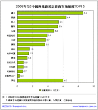 根据艾瑞咨询最新发布的《2008年第三季度中国网络游戏市场监测报告》研究显示,2008年第三季度中国网络游戏市场规模同比增长51.9%%,环比增长7.7%%,达54.7亿元。盛大网络以8.6亿元稳坐游戏榜首,网易、巨人、腾讯、九城分列二至五位,与Q2相比,前八位的排名没有任何变化,金山则是1.6亿元首次进入前10,排名第九,此外值得注意的是,以研发能力见长的成都梦工厂凭借着出色的表现,以300