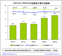 根据艾瑞咨询即将推出的《2008年第三季度中国搜索引擎市场监测报告》统计,以运营商营收总和计算中国搜索引擎市场规模,2008Q3中国搜索引擎市场规模达14.29亿人民币(约合2.10亿美元),同比2007Q3的8.38亿人民增长70.5%%,环比2008Q2的12.71亿元平稳上升12.4%%.北京奥运会的举办导致企业间的商业有所活动减少等,对搜索引擎市场规模的增长产生一定的影响,因此整体市场