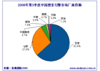 根据易观国际《2008年第3季度中国搜索引擎市场季度监测》报告显示,2008年第3季度,不计算渠道收入,搜索引擎厂商收入达到14.64亿元,同比增长放缓,达78%%,环比增长达到19%%。中国搜索引擎市场厂商份额中,百度以63.4%%居首位,谷歌为27.8%%,中国雅虎为4.7%%。 从厂商格局上来看,百度、谷歌、中国雅虎依然占据前三名。具体来说,百度收入市场份额有所下滑,而谷歌和中国雅虎的收
