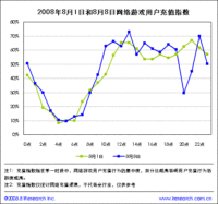 开幕式当晚游戏用户充值指数出现跳水 根据iResearch艾瑞咨询最新推出的网民连续用户行为研究系统iUserTracker的最新数据显示,在2008年8月8日奥运会开幕式期间,网络游戏用户充值的活跃度下降50%%以上。根据用户充值习惯来看,每天晚上20点左右应当是充值的高峰期,但在奥运开幕当天的20点用户充值指数仅与凌晨2点左右持平,而在运动员进场阶段用户充值指数开始补涨,超过以往正