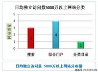 2008年5月5日-5月11日,日均独立访问者超过2000万的中国网站共计20家,其中日均5000万独立访问者以上的网站为8家,2000万至5000万独立访问者之间的网站为12家,具体指标如下:日均独立访问量达到5000万的网站主要集中在综合门户、搜索引擎及分类目录三类。其中:综合门户类网站占 4家搜索引擎类网站占 3家分类目录类网站占 1家日均独立访问量在2