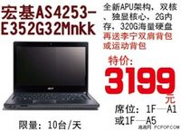 泡泡网上海分站3月17日 融合架构的APU(加速处理器)刚在年初举行的CES大会上发布,今天就为大家推荐一款搭载APU的14寸宏碁Aspire 4253笔记本,新尚特价3199元!喜欢的朋友千万不要错过了! 宏碁 AS4253-E352G32MNKK: 外观方面,稳重的黑色和靓丽红色两种时尚靓丽的色彩,3D纹理设计,特有的浮萍式键盘, 1366 x 768分辨率的14英寸高