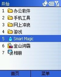 电脑上有WINDOWS优化大师,没想到WM上也出了个优化软件,1月12日出的V1.0,我装上后发觉很多功能不能用,据说是主题设置的问题,18日已经出了V2.0了,更新速度够快的,我再次下载安装,界面差不多,但很多功能都能用了,就趁热打铁写这篇文章和大家一起分享一下使用心得。 上图是Smart Magic的开始菜单图标和程序界面,略显简单,但水滴造型的图标还是挺好看的,接着我们