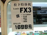 [泡泡网上海分站讯]松下FX3是一款已经停产的FX系列轻薄机,虽然是低端产品但依然拥有光学防抖和莱卡镜头的配备。近日有商家为了配合该机的下市,特开展了买机器送礼包的优惠活动。 店内小公告和展柜图 FX3的外观延续了家族特征 因为均出自松下的超薄FX系列,FX3在外观上与其他兄弟机型非常相似,小巧超薄的身躯透露出高雅与时尚,全金属的外壳质感非常。不过FX3只提供了黑色和银色两种颜色可