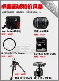 经过一期又一期活动的总结分析,卓美摄影器材商城www.zm7.cn推出的周三特价商品越来越符合广大影友的选购需求,众多品牌、众多商品、优越的品质、超低的售价无不是您抢购的理由,关注便有收获,笔者带你关注一下最新的活动详情: 一、活动时间:2009年5月13日早9:00—14日早9:00。 二、特价商品内容: (1)佳能EF-S18-55mmf/3.5