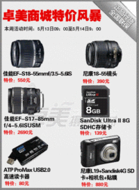 超低超值特价、限时限量抢购,卓美摄影器材商城www.zm7.cn每周一期的特价风暴活动如期举办,周周精彩、期期实惠,便宜的不只是一点点。为了保证喜欢的影友都能够顺利抢购,笔者现将最新的活动详情第一时间与大家一起抢先分享,具体如下: 特价镜头之尼康18-55 一、活动时间:2009年7月15日早9:00—7月16日早9:00。 二、特价内容: &nb