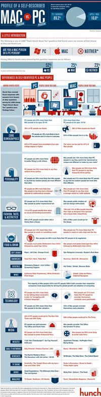 苹果火箭式的发展速度让全球开始关注数年前被认为是处于边缘的小众Mac群体,Hunch.com根据调查得来的数据绘制了一张有关于Mac和PC用户生活习惯差异的信息图表,涵盖饮食习惯、政治倾向、个人喜好、穿衣风格和对媒体关注度等。里面提供了一些有趣的数字,例如Mac用户喜欢吃蔬菜,口味偏咸而PC用户则喜欢美式快餐,口味偏甜等,非常有趣: &nbs