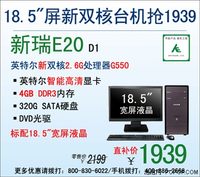 泡泡网电脑频道3月21日 在业界神舟电脑素有“价格屠夫”之称,以超低的价格,优秀的配置,赢得广大消费者的青睐。目前神舟有一款专为家庭、商务等用户量身定制的台式电脑新瑞E20 D1,笔者了解到,现在这款台式机的官方标价仅为2199元,在享受260元政府节能补贴后,实际仅需花费1939元,近期更换新机的朋友,不妨考虑下! 神舟新瑞E20 D1采用超省空间的小机箱设计,标配一台18.5