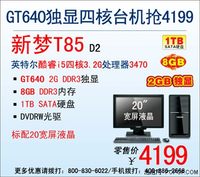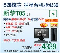泡泡网电脑频道3月27日 神舟新梦T85秉承神舟电脑外观典雅大方、配置均衡实用、价格体贴到家的亲民风范,以超高的性价比和超强性能而深得消费者认同。现在最新的D2版本已将显卡升至了GT640 2G DDR3,真可谓是游戏发烧友们最大的福音。配合原本实力超群的英特尔酷睿i5四核3.2G处理器3470和8G海量内存,势必给你带来酣畅淋漓的玩机体验!加上1TB超大硬盘和20英寸宽屏液晶,能充分满足