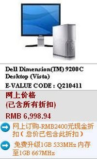 搭配酷睿2双核E4300的处理器的整机似乎成为商家宣传的重点,不少品牌机的商家都对旗下这种机型促销,希望能吸引更多消费者的注意。每周都有新促销活动的DELL本周针对这种机型也有新的优惠,其中网上定购型号为Dimension 9200C(Q210411)的这款整机可优惠2400元,感兴趣的朋友可以关注下。 除了处理器为关注的焦点以外,其他的配置也是目前品牌机市场上比较热门的,譬如主流