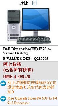 本周,采用直销模式的戴尔又有新的促销活动,型号为DELL Dimension E520-Q210205的这款整机现在可以免费升级至双核处理器,而且网上定购可优惠700元,优惠后的售价为4399元。 具体的升级方案是:凡在3月30日前购买DELL Dimension E520-Q210205这款整机就可以免费把原来奔腾4的处理器升级成为Intel Pentium D915的双核处理