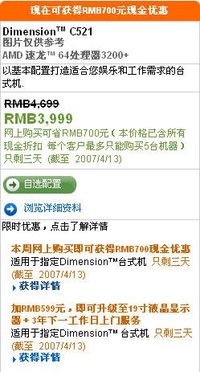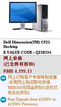 本周,采用AMD Athlon64 3200+处理器的DELL Dimension C521(Q210334)可以免费升级到3500+的处理器,如果网上订购戴尔的这款入门级家用机就可以获得500元现金折扣,享受优惠后它的价格为4199元,同时还免费升级CPU,可以说相当值得考虑。 需要提醒大家的是,此次免费升级以及现金优惠的促销活动截止到本周五,也就是3月30日,如果有想购买此款整