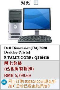 本周,采用双核处理器、20英寸宽屏显示器以及Vista操作系统型号为Dimension E520(Q210410)的DELL整机有新的促销活动,现在网上定购优惠价格为5799元。不仅如此,如果购机的同时再加499元就可以把显示器升级成22英寸宽屏,而且还享受3年下一工作日上门服务,感兴趣的朋友可以关注下。 需要特别说明的是,此次DELL的这款整机享受现金优惠的活动截止到4月6日也