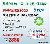 随着神舟电脑2008寒促新品策略发布会的顺利举行,2999元笔记本的攻势已是铺天盖地,掀起城中热话。台式机方面也不落人后,免费升级、促销降价和新品上市一个也没有少,不论新瑞还是新梦系列,2880元起就能买到,带你享受比组装机更好更便宜的新境界。 素有“节能静音之王”称号的新瑞系列台机一直拥有良好的口碑,整机深黑的外观简洁大方,性能配置也堪称主流,从本周开始S300D和D400还齐齐免