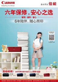 2015年8月18日,佳能(中国)有限公司宣布再次针对家庭用户推出喷墨一体机产品6年保修服务。8月18日至10月18日期间,凡购买指定款佳能喷墨一体机的前8000名家庭用户,在活动网站进行注册,即可轻松享受6年保修服务。据了解,此次6年保修服务的网上注册流程更简便,覆盖的机型范围也更广,旨在让更多家庭用户体验佳能长久、贴心的售后服务,实现安心打印。 此前,佳能针对三款