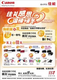 自2012年10月19日至12月31日,佳能腾彩PIXMA喷墨打印机年末促销活动将在全国范围内全面展开。届时,您只要在全国范围内的任一家佳能打印机认定店购买任意型号佳能腾彩PIXMA喷墨打印机或喷墨原装墨盒,即可获赠缤纷好礼!此外,购买指定机型还可参加第二重“礼上加礼”活动,获得相应的精美礼品,包括相框组合、或彩虹伞、或空气加湿器、或电话机等。值得一提的是,此次参与“礼上加礼”活动的均是佳