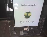 苹果iPod是数码MP3领域的领跑者,也是所有数码MP3厂商最大的竞争者。特别是两著名的国际大厂微软Zune和苹果iPod的竞争更是到了无孔不入的地步。日前就有消消曝光在微软Zune团队办公室内,出现了微软最新推出的产品--“iPod Amnesty Bin”。 微软的iPod Amnesty Bin 其实这款“iPod Amnesty Bin”实际上就是一个贴着标语的垃圾桶,一个绿色的苹果