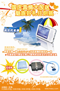 国庆、中秋双节在即,为回馈新老客户,回报魅友长期以来对魅族产品的支持与关爱,日前魅族科技斥资百万,特别推出针对miniplayer的大型全国促销活动,凡在十一黄金期间购买miniplayer的用户,买就送精美礼品一份,三款礼物任你挑选。精彩的魅族百万促销活动,带你一起去领会魅族的动感音乐世界,为节日的快乐气氛锦上添花。 2006年9月25日-10月15日期间,魅族将举办“国庆真情大放送,魅族