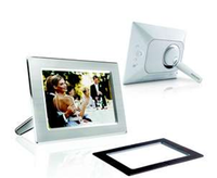 数码相机的普及使得我们的电脑里堆满了成千上万的照片,如何与亲朋好友分享呢?不是挤在电脑屏幕前,也不是不计成本地把照片都冲印出来,天敏DPF800给了我们一个不错的答案。 融入家庭的时尚 DPF800纯白色的外观给人清爽的感觉,灰色的花纹图滕和天敏的标志则给相框带来了一种高档而富有设计的气息。从正面观看,DPF800和普通的相框并没有太大的区别,因为一切的接口和按键都巧妙的设计在