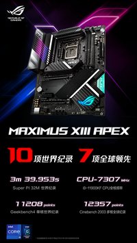 华硕Z590主板近日高调地展现了自己的超频实力。其中,明星主板ROG MAXIMUS XIII APEX(简称ROG M13A)一举将最新11代酷睿处理器i9-11900KF超频至全核7.3GHz,更刷新Super PI 32M世界纪录,跑进了3分40秒!ROG M13A主板在短时间内共创造10项世界超频纪录,斩获7项全球领先的傲人战绩,不负APEX超频怪兽的威名,堪称当之无愧的极限超频新神器!
