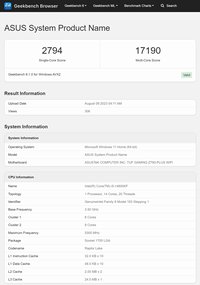 英特尔14代酷睿台式机处理器i5-14600KF的跑分成绩目前出现在了geekbench数据库当中。其单核心成绩为2794分,多核心成绩为17190分。该测试平台选用的是华硕Z790主板,测试时间为8月9日。