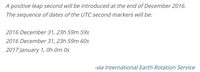 国际地球自转和参考系统服务地球定向中心(IERS)近日通过推特重申,国际标准时间UTC将在格林尼治时间2016年12月31日23时59分59秒(北京时间2017年1月1日7时59分59秒)之后,在原子时钟实施一个正闰秒,即增加1秒,然后才会跨入新的一年。IERS这次重申这一决定,希望引起科技行业和IT领域的注意,2012年添加闰秒时Reddit、Foursquare, LinkedIn由于