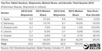 iPad的整体销量接连下滑,为了挽救这个尴尬的局面,苹果后来推出了iPad Pro,按照他们的思路来看,销量既然不可避免的下滑,那么让收入回到当初则是完全可以的。 从苹果最新的财报看,iPad共卖出了926.7万台,相比去年同期下滑6%%,但42.55亿美元的营收与去年同期的42.76亿美元基本持平,这说明一个情况,那就是iPad Pro带来相对还不错的收益。 IDC今天送出的最新出货量数据