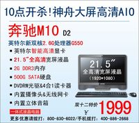 泡泡网笔记本频道12月12日 双12正式开抢,神舟电脑也推出众多优惠再造购机热浪,其中,全高清大屏一体机奔驰M10 D2、独显i7超级本飞天UN47 D2开启超值秒杀活动,价格低至1999元起,超大优惠不容错过!一体机奔驰M10 D2搭载英特尔双核处理器G550,内置英特尔智能高清显卡,配合21.5英寸全高清大屏(分辨率达1920*1080),整机性能均衡实用,非常适合家庭用户;如果你计划