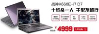 最火爆的笔记本,最热门的游戏本系列,游戏玩家首选,GTX960M战神游戏i7本K660E-i7D7,搭载第四代酷睿i7-4710MQ处理器,配备15.6吋1080P全高清大屏,加8G超大内存、128G SSD+1TB HDD硬盘,1月17日0:00神舟天猫店聚划算4999元准时开抢,原价5699元的神舟战神独显本K660E-i7D7狂降700元聚划算特惠只需4999元,详情登录神舟电脑天猫