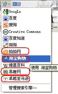 网上购物,免去逛街劳顿之苦,轻松又自在!有什么方法能快速、直接、轻松地淘到自己喜欢的宝贝呢?火狐中国版来帮你! 火狐中国版搜索框:快速淘 火狐中国版(Firefox China Edition)的搜索框中内置“淘宝购物”搜索,只要点击浏览器右上角的搜索框,选择“淘宝购物”,即可通过火狐快速找到自己喜欢的宝贝!此外还有“卓越亚马逊”、“易趣网”、“拍拍网”等购物搜索供大家