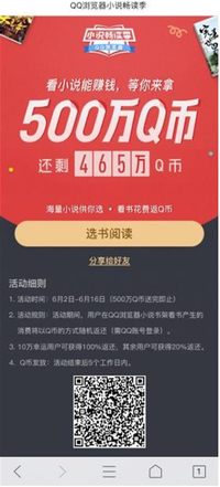 看书还赚钱,来吗?!海量小说在线,看吗?!!千万书友陪你,约吗?!!!6月2日,QQ浏览器正式启动“小说畅读季”主题活动,在未来两周内,当用户在QQ浏览器看正版小说,均可得到一定比例的消费返还,最高可获得100%%全额返现。也就是说,在QQ浏览器既能看海量正版书还能赚钱!(“小说畅读季”活动截图)据了解,此次“看小说赚Q币”活动是QQ浏览器“小说畅读季”系列活动的首发活动, QQ浏览器豪掷500万Q